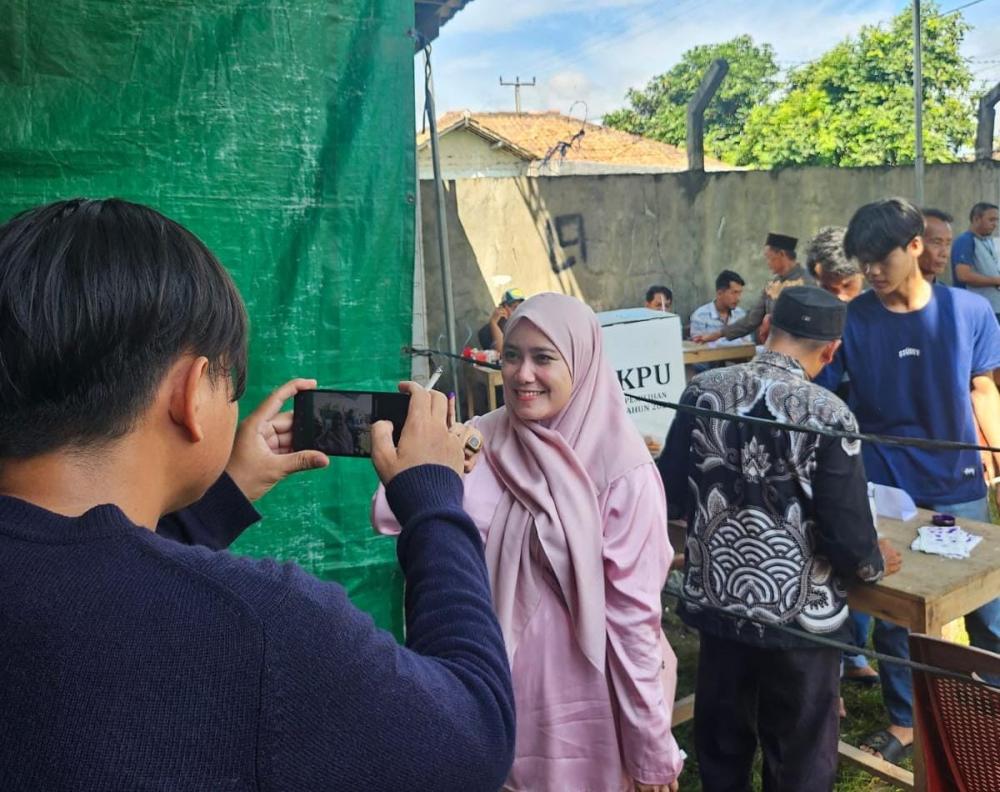 Desi tiba di lokasi sekitar pukul 09.26 WIB dan tampak menyapa hangat warga yang tengah menunggu giliran mencoblos.